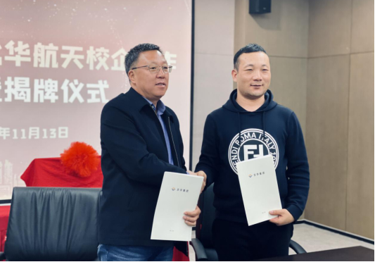 揭牌儀式上,北華航天工業(yè)學(xué)院校長陳剛、京華企業(yè)總經(jīng)理陳鐵柱一起為此次校企合作揭牌。