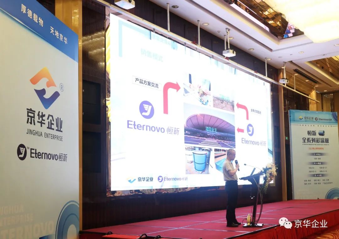 在接下來的一小時(shí)時(shí)間里,京華企業(yè)“恒新“品牌營銷副總李明曄先生,從企業(yè)實(shí)力和品牌定位,新型鋅鋁鎂基材以及全系列”恒新“彩涂產(chǎn)品線,”恒新“產(chǎn)品定制服務(wù)三方面向與會(huì)嘉賓做了全面的講解,全方位立體化向大家詳細(xì)闡述了”恒新“產(chǎn)品解決方案的獨(dú)特價(jià)值,以創(chuàng)新設(shè)計(jì)理念,幫助綠色建筑的節(jié)材,節(jié)水,節(jié)能,提升環(huán)境舒適度等各方面達(dá)成極大提升,以綠色理念幫助廣大客戶實(shí)現(xiàn)彩涂產(chǎn)品銷量的可持續(xù)增長。